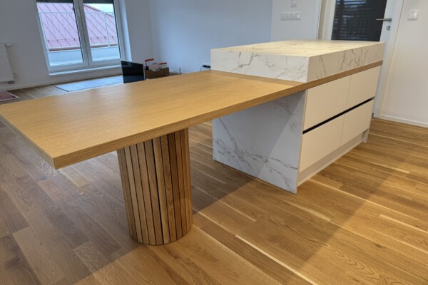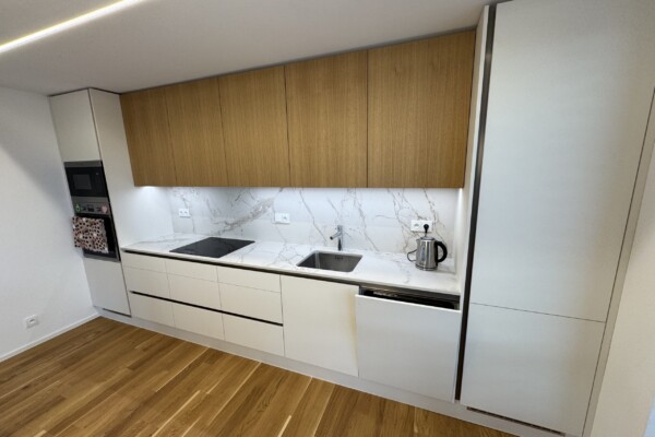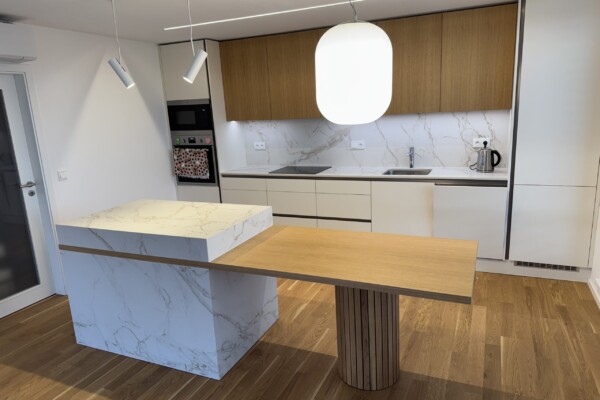 Pro realizaci tohoto bytu jsme zpracovali unikátní návrh s důrazem na atypické použití materiálu DEKTON – vysoce kvalitního umělého kamene. Tato volba umožnila vytvořit elegantní a odolné povrchy, které v interiéru působí moderně a zároveň nadčasově. Výsledek odráží požadavky klienta na jedinečný design, který zároveň nabízí praktické využití a snadnou údržbu.
